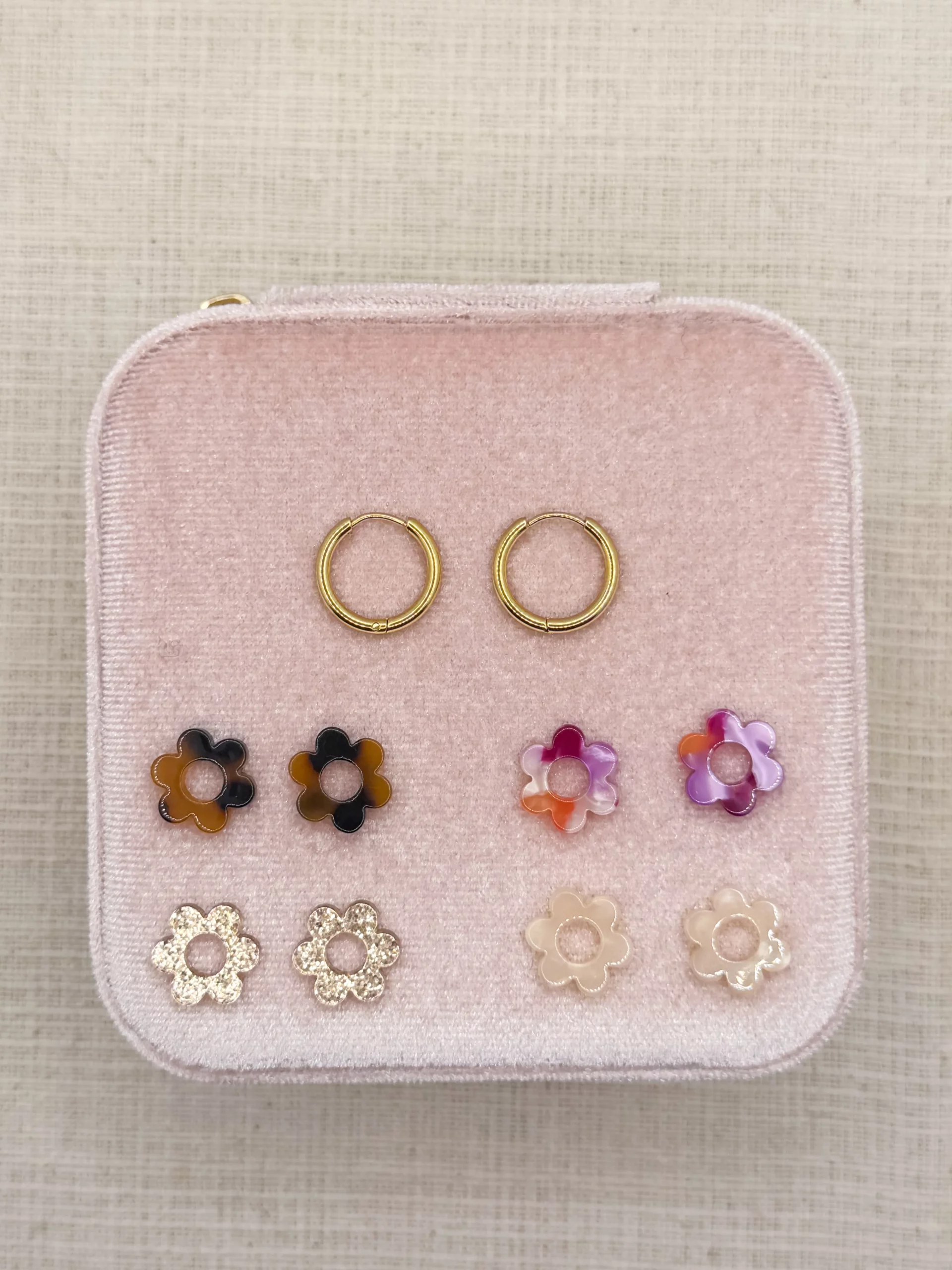 Mini créoles légères (15mm de diamètre) en acier inoxydable, avec des pampilles fleurs interchangeables.