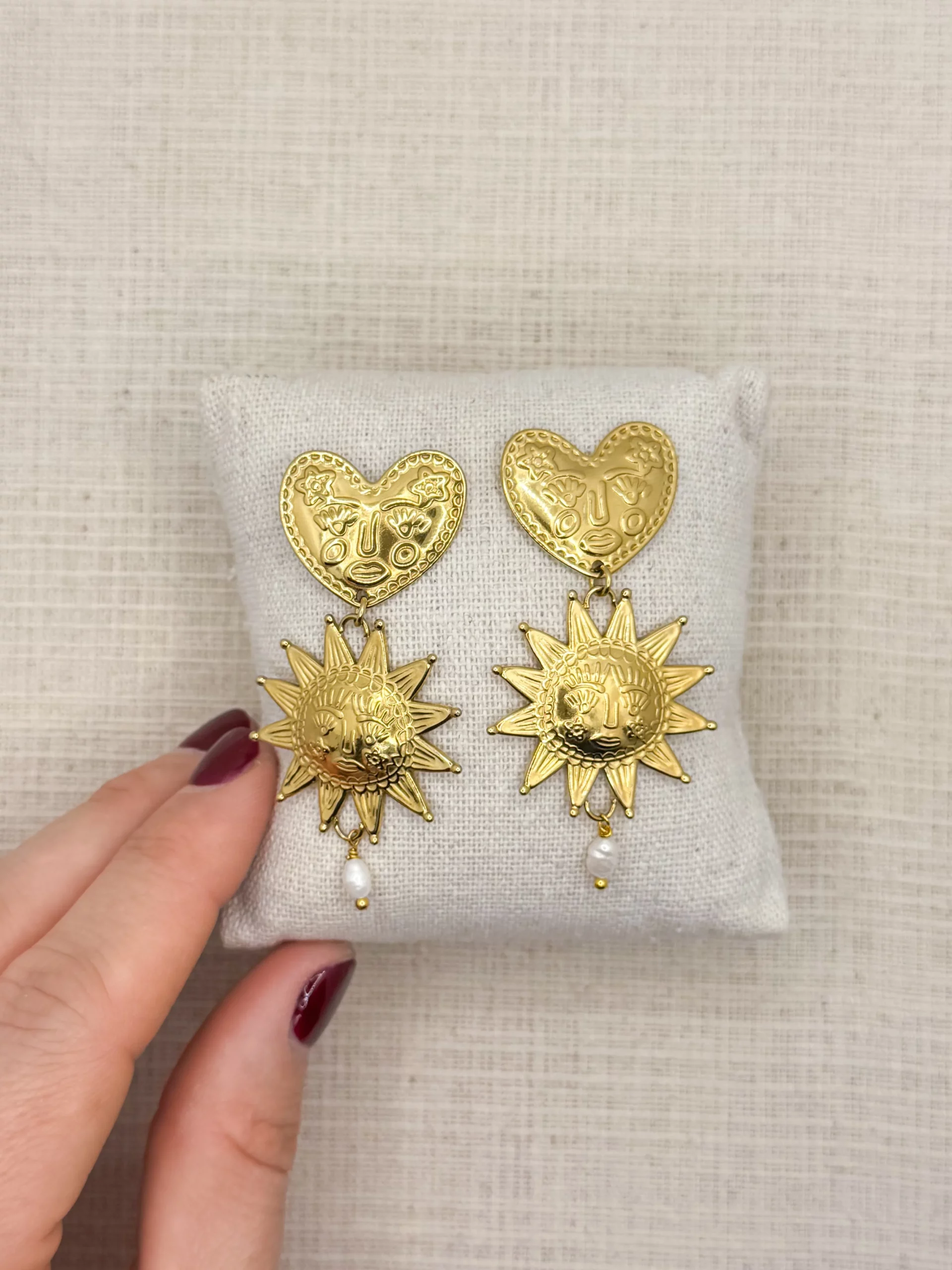 Paire de boucles imposantes avec beaucoup de caractère : un coeur, un soleil et une goutte de perle de culture.