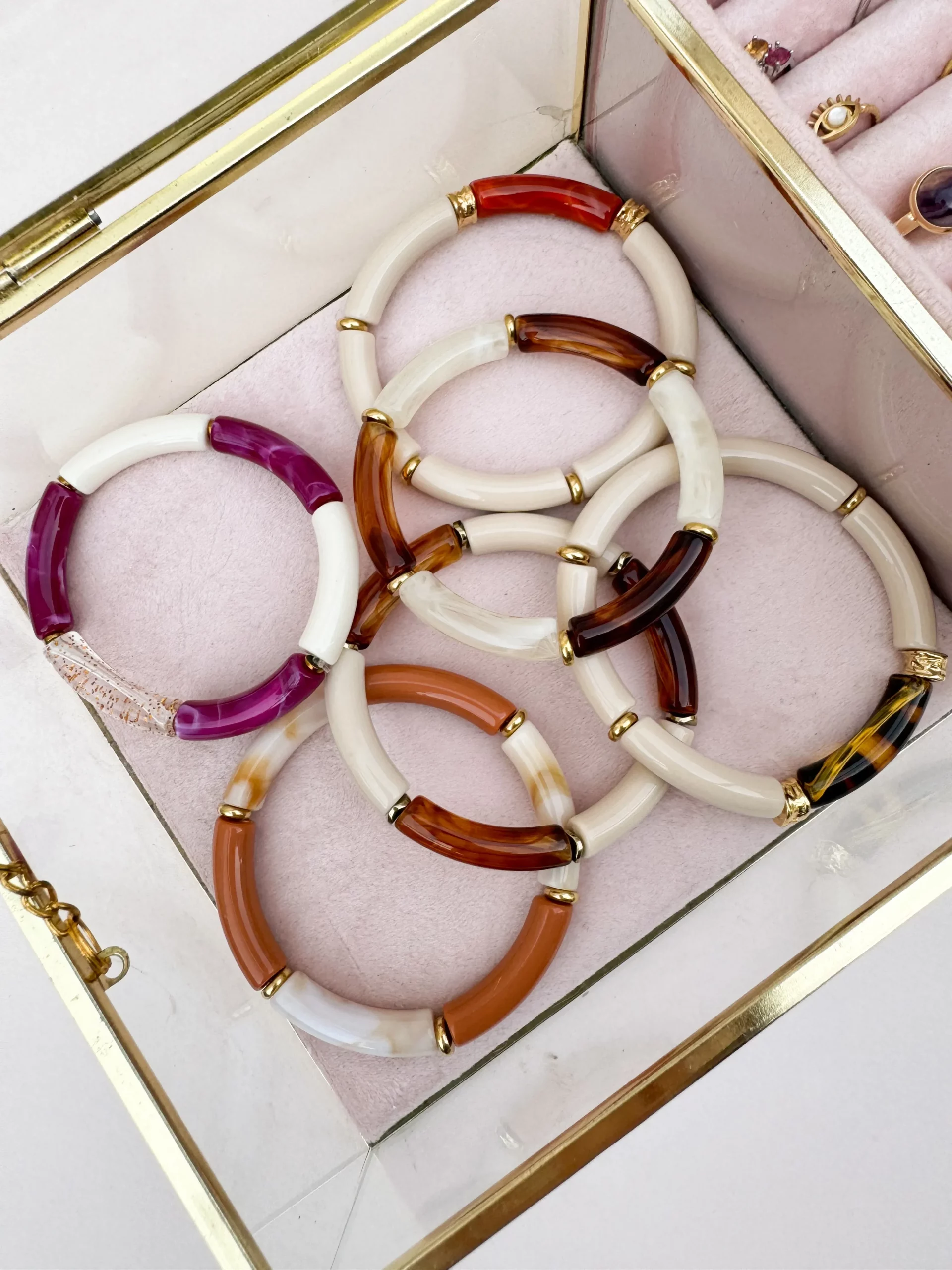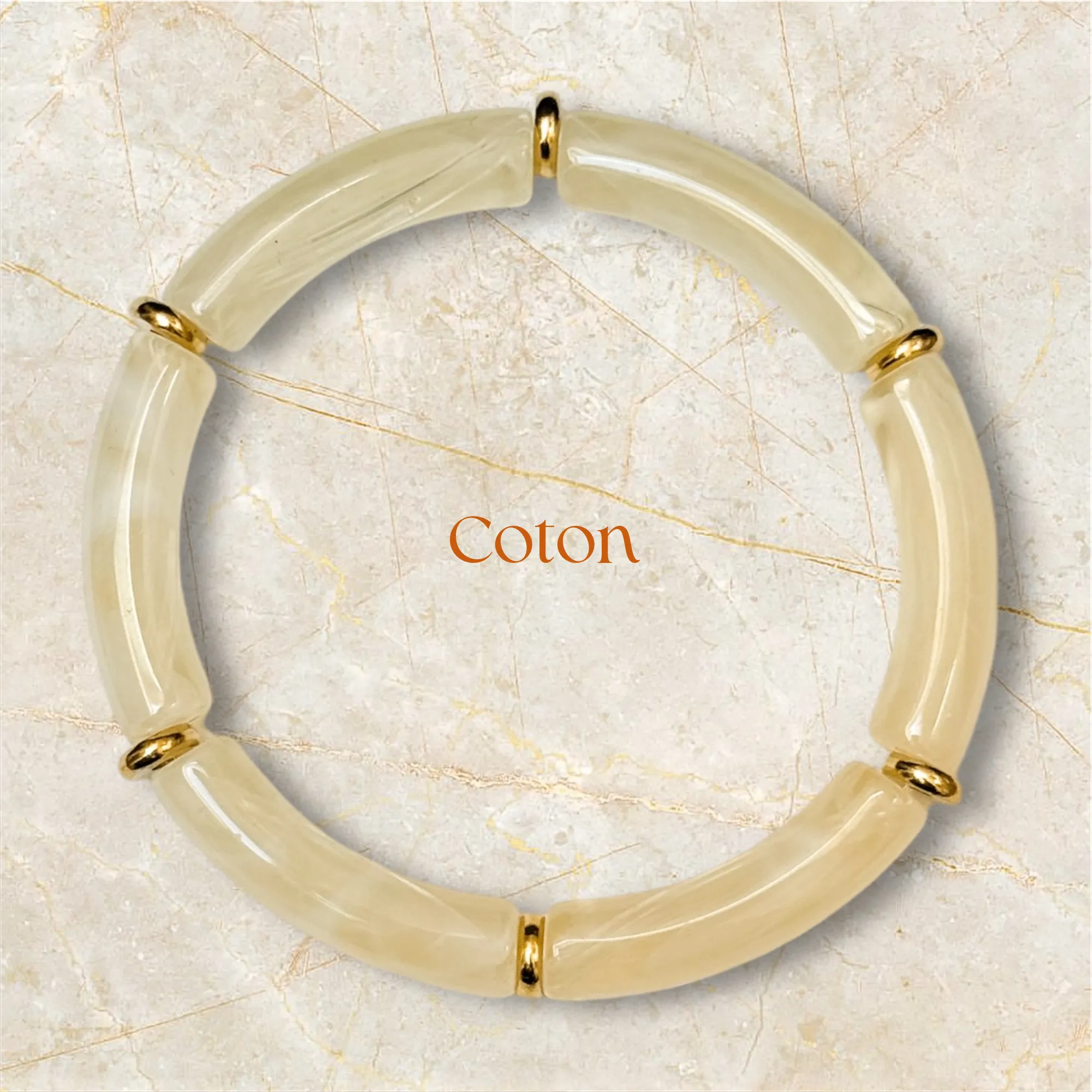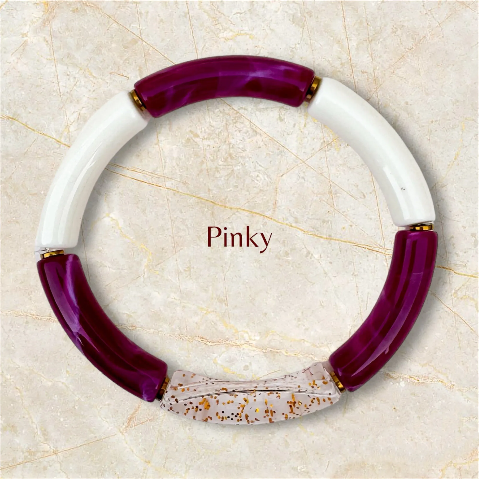 Bracelet coloré élastique composé de perles de résines acryliques.
