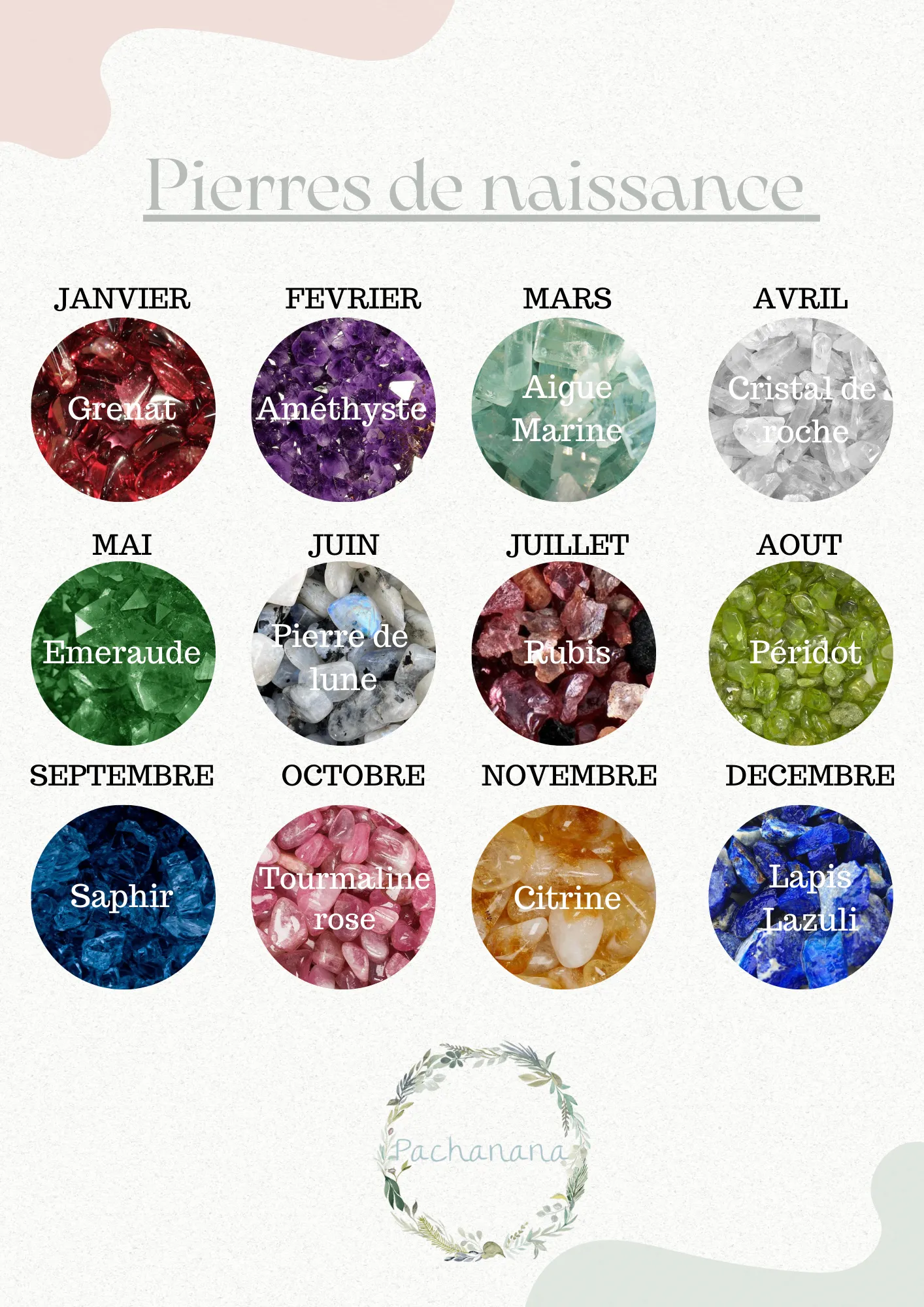 | Pierre de naissance | Janvier – Le grenat, Février – L’Améthyste, Mars – L’Aigue-Marine, Avril – Le Cristal de Roche, Mai – L'Emeraude, Juin – La pierre de lune, Juillet – Le Rubis, Août – Le Péridot, Septembre – Le Saphir, Octobre – La Tourmaline rose, Novembre – La Citrine, Décembre – Le Lapis lazuli |