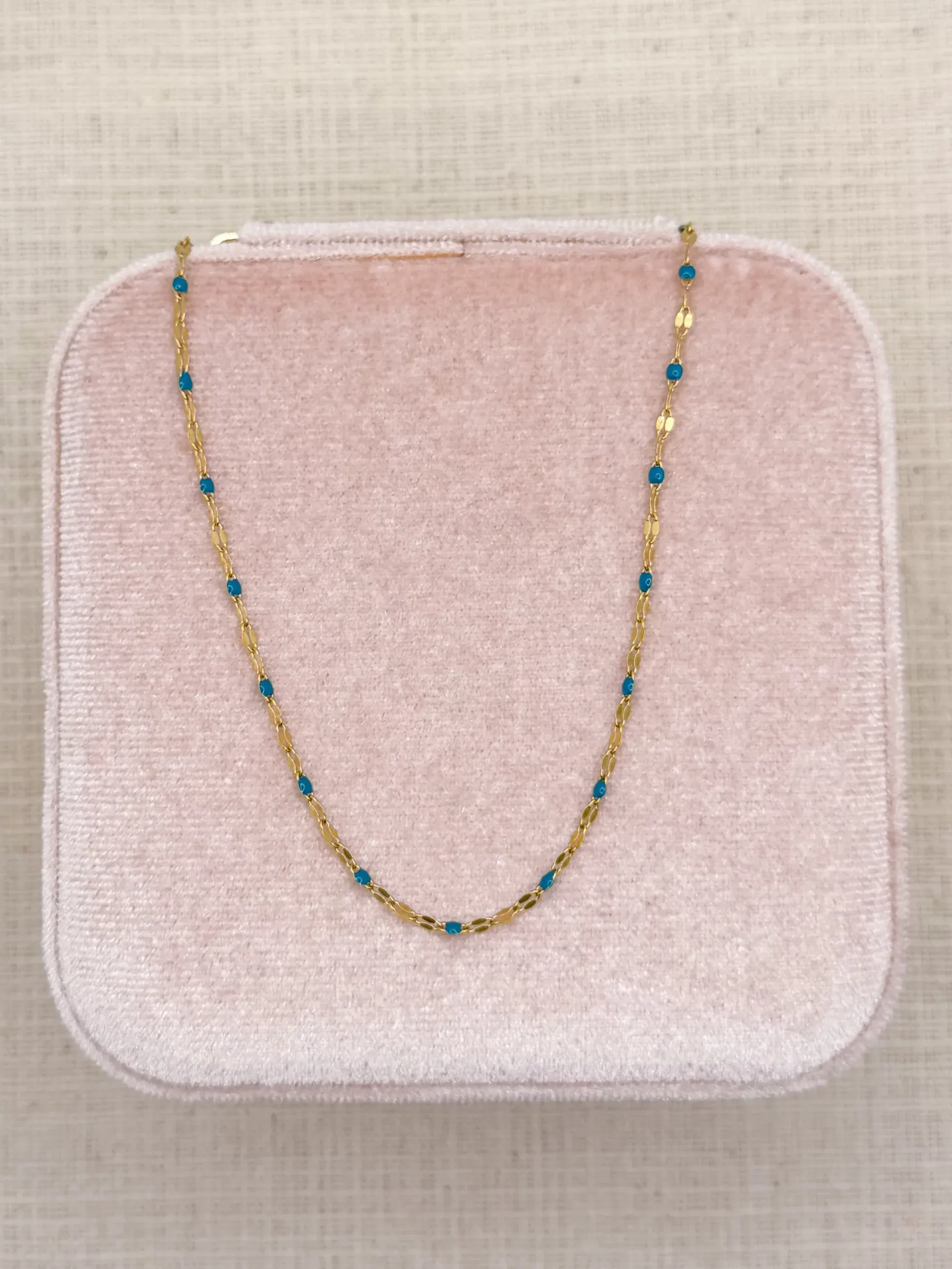 Collier très fin composé d’une chaîne avec détails émaillés bleus.