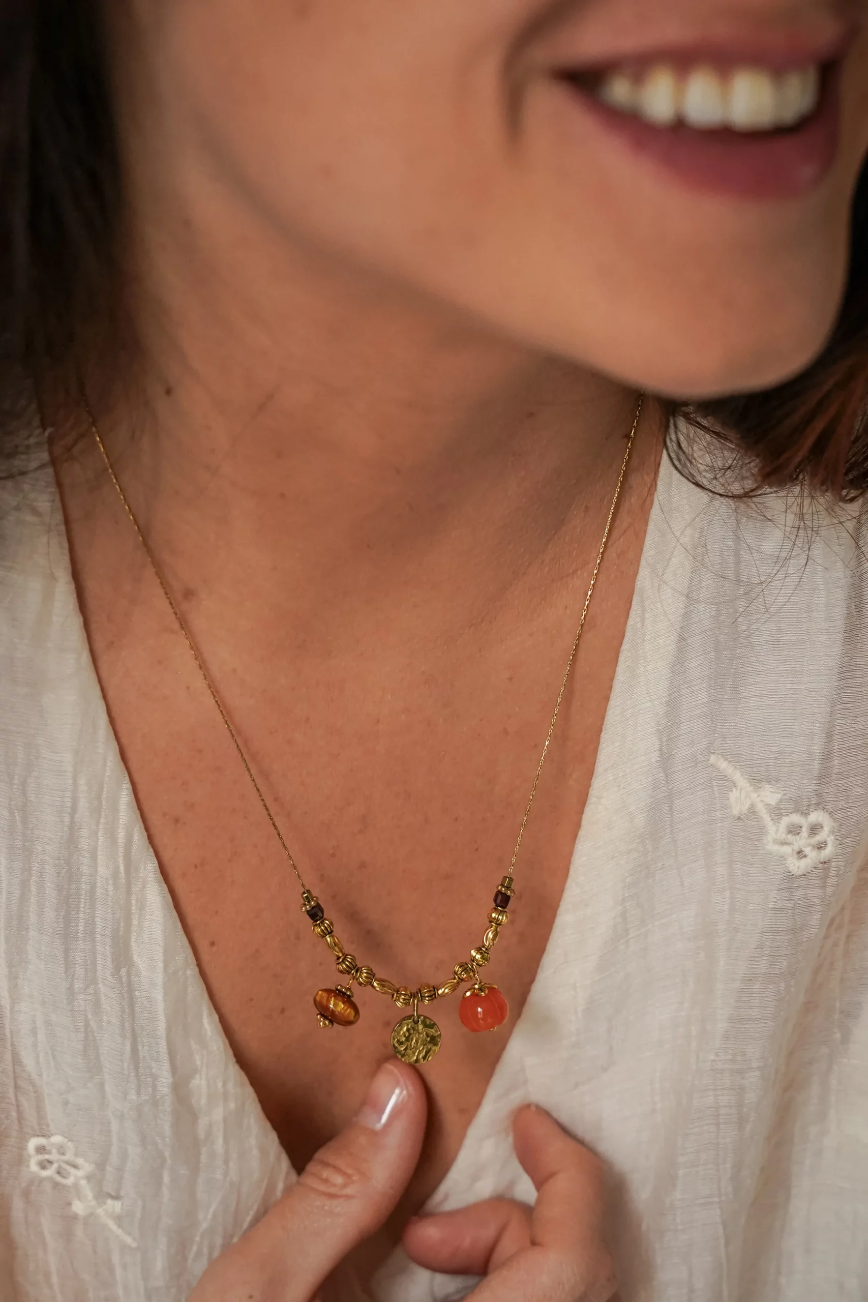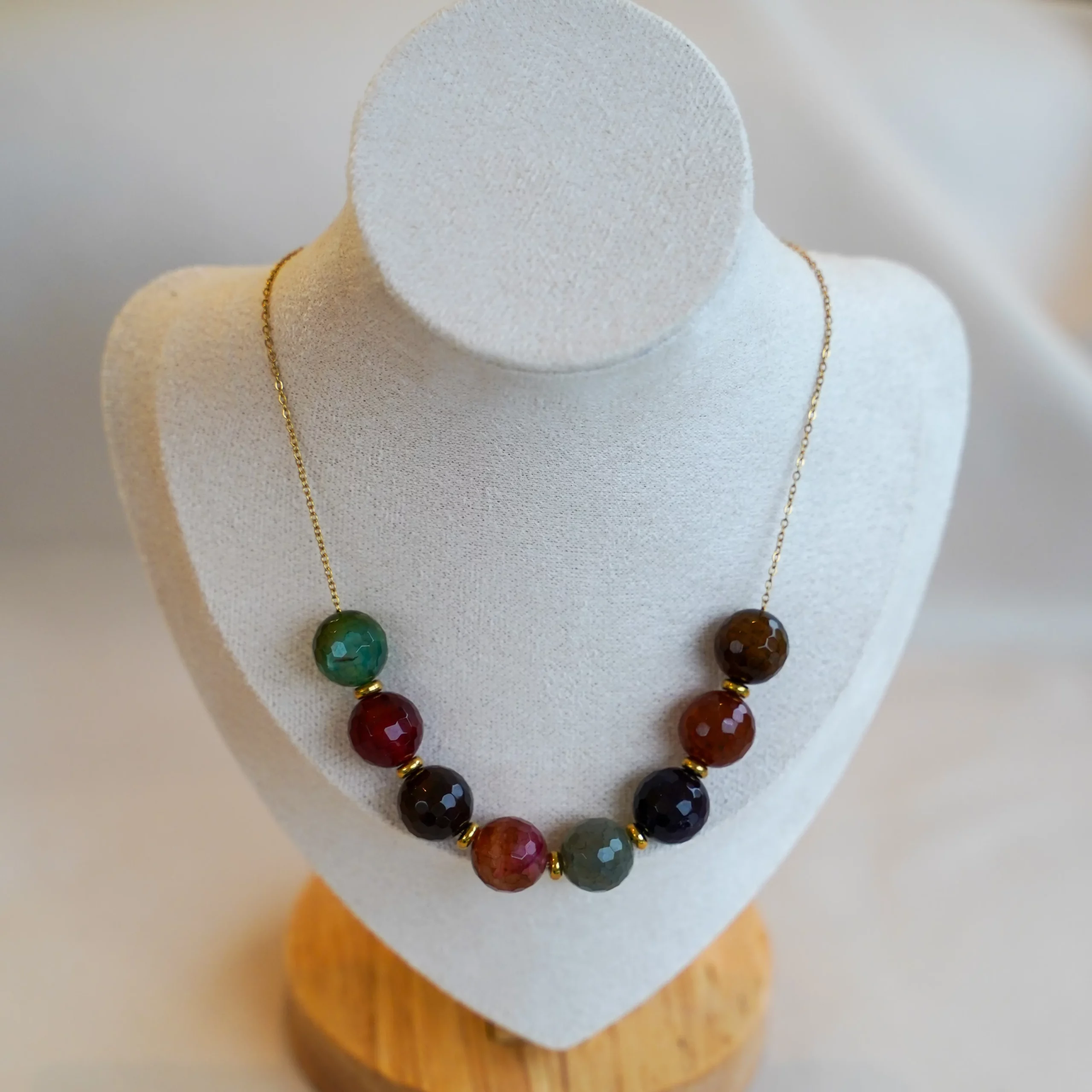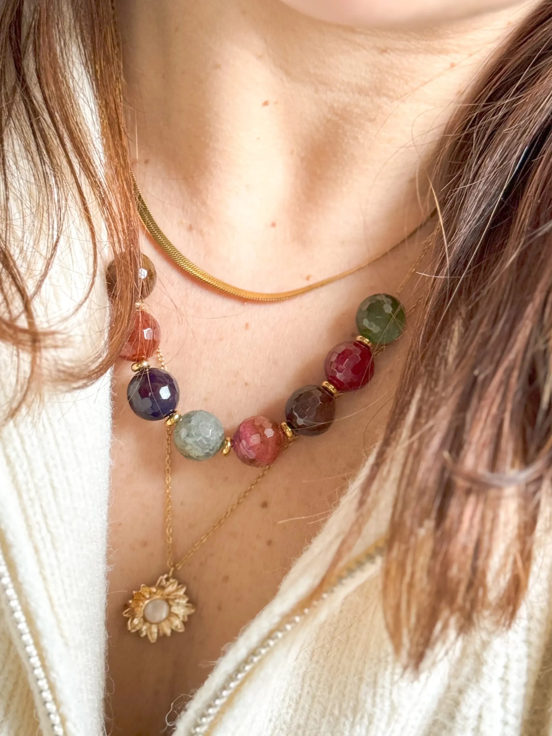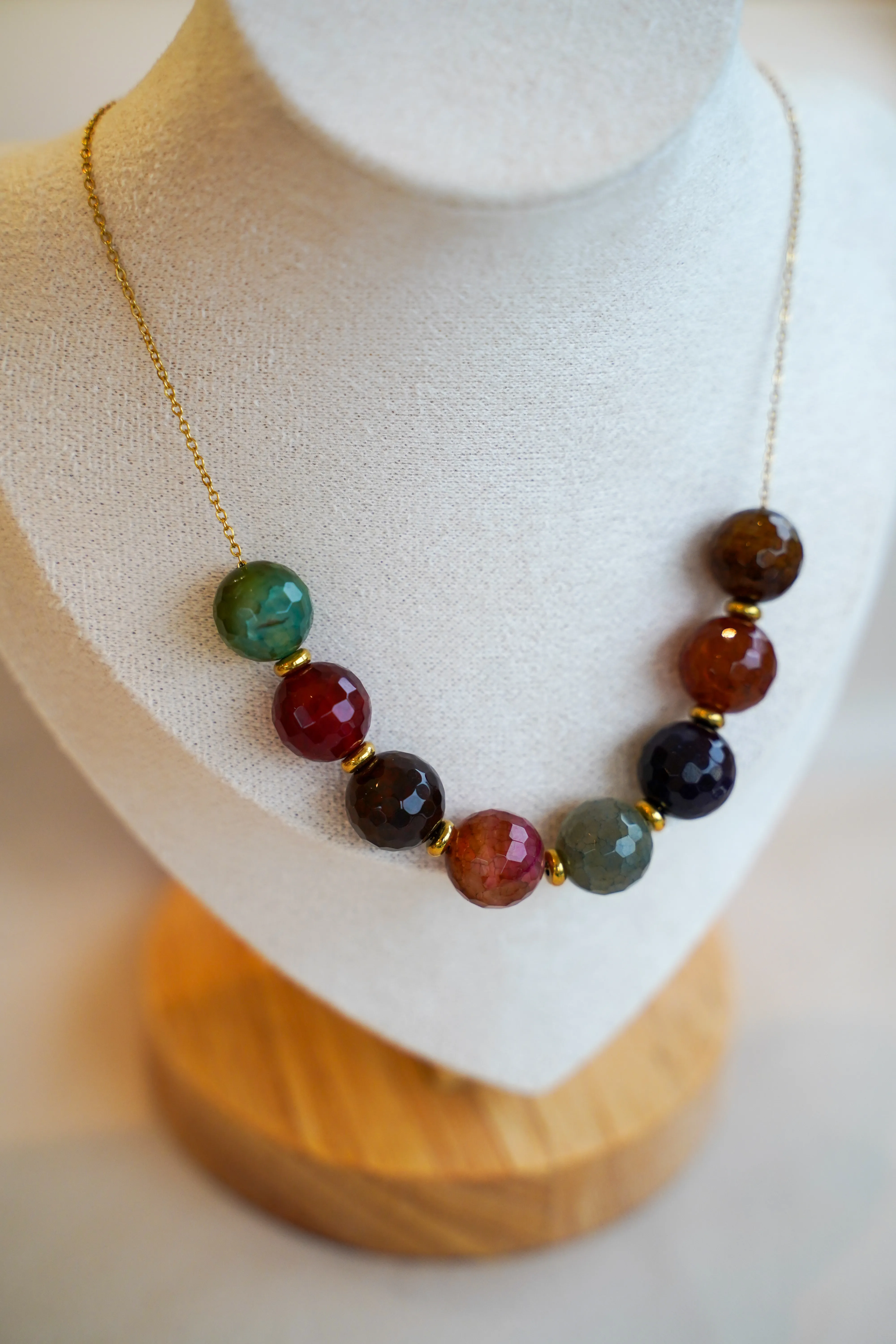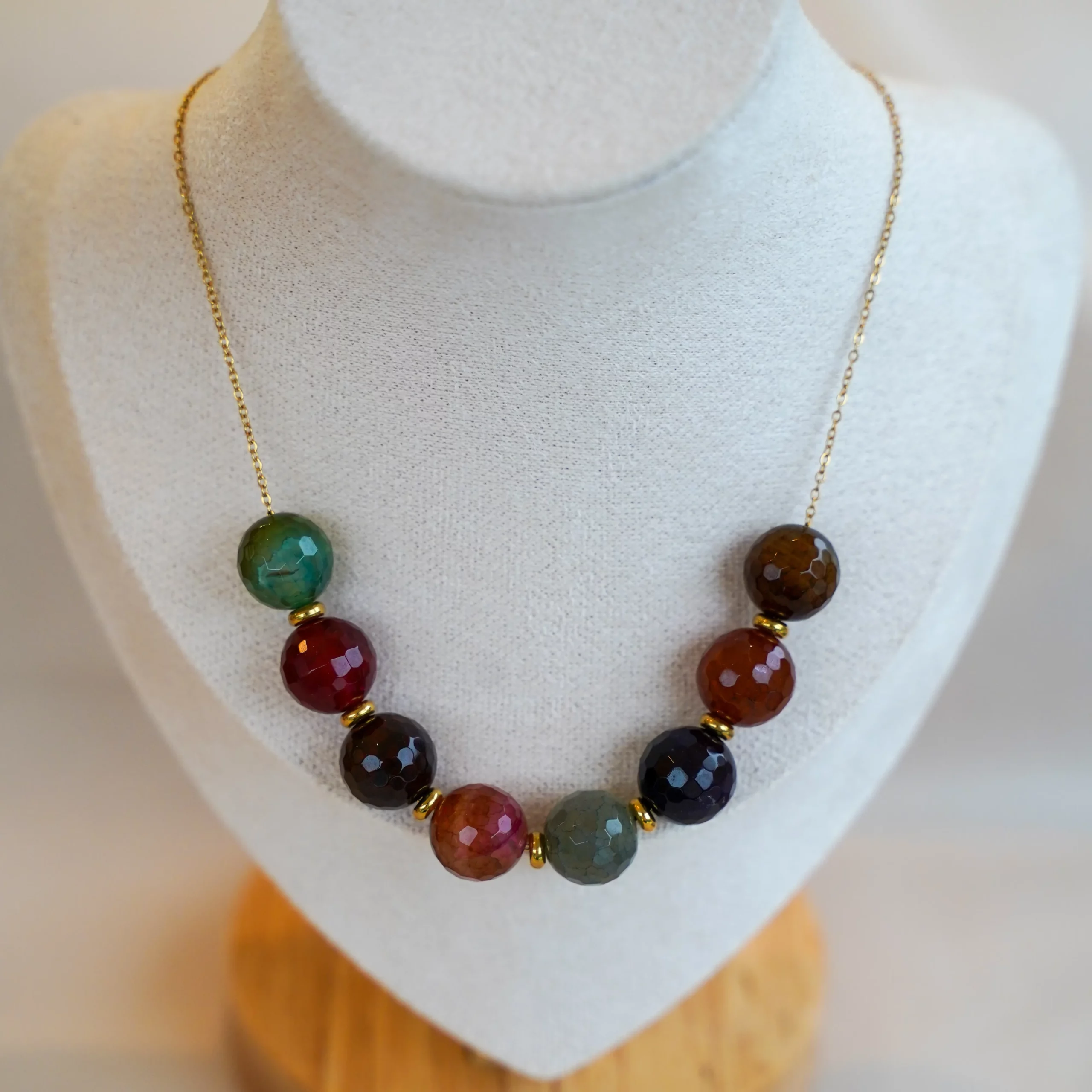 Collier de caractère composé d’une chaîne fine sur laquelle coulisse 8 perles d’agates crazy facettées.