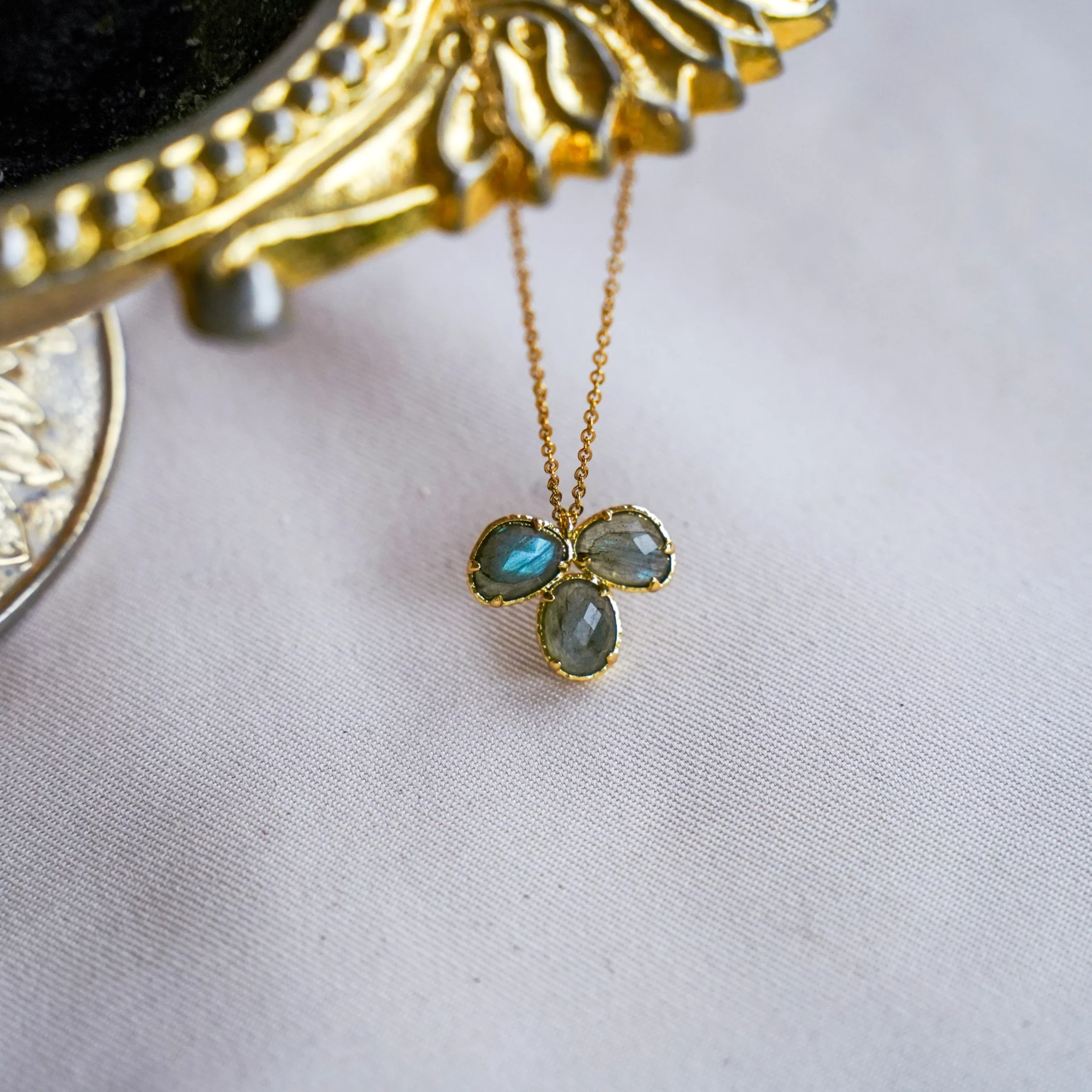 | Pendentif | 3 gouttes labradorite, Rubis Zoïsite, Fluorite, Fleur de Tourmalines melon |