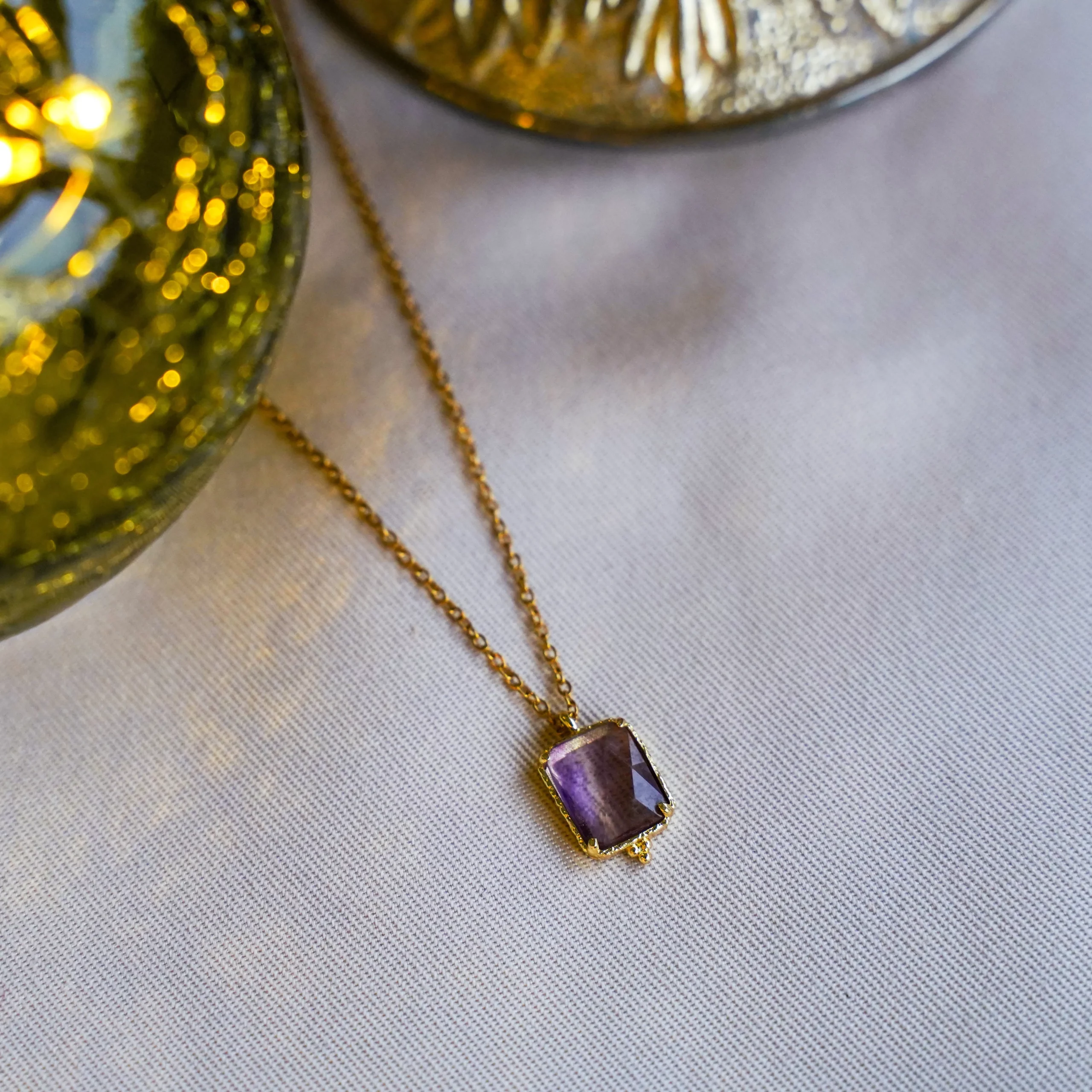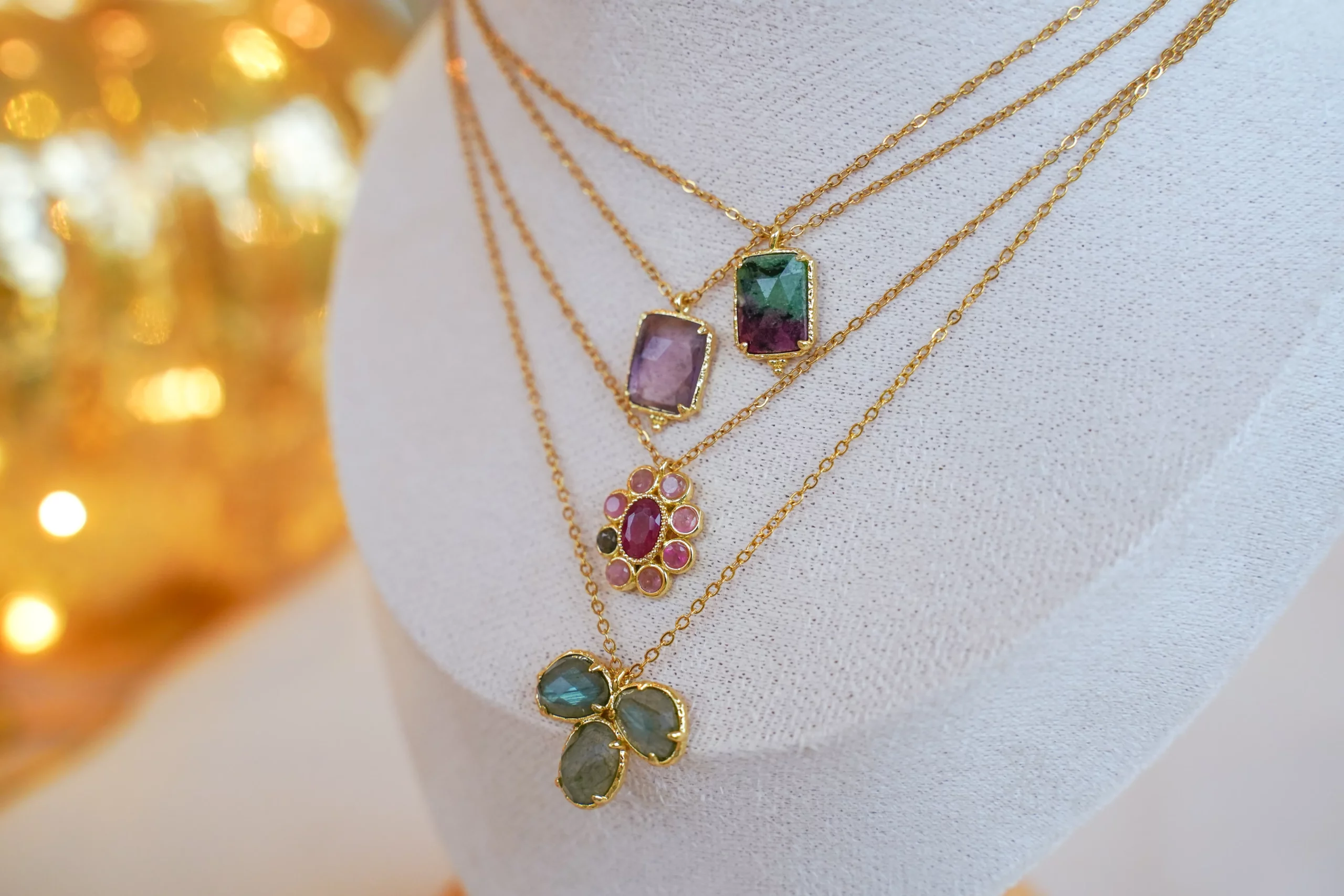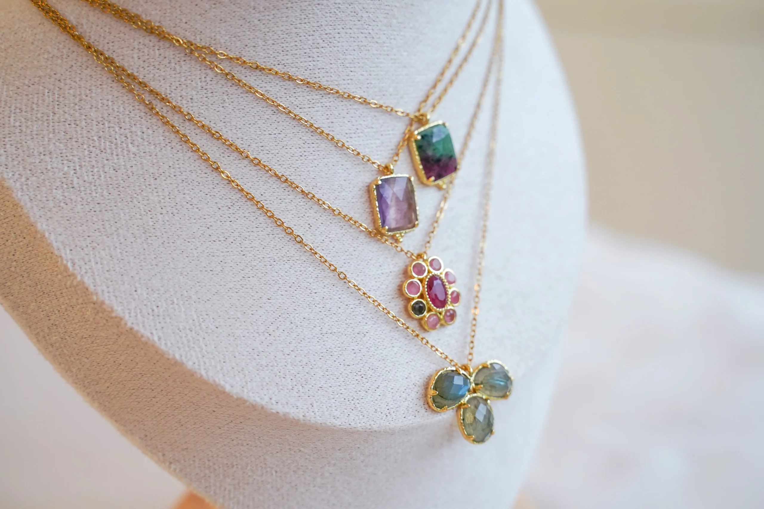 Colliers composés d’une chaîne fine en acier inoxydable et d’un pendentif empierré au choix.