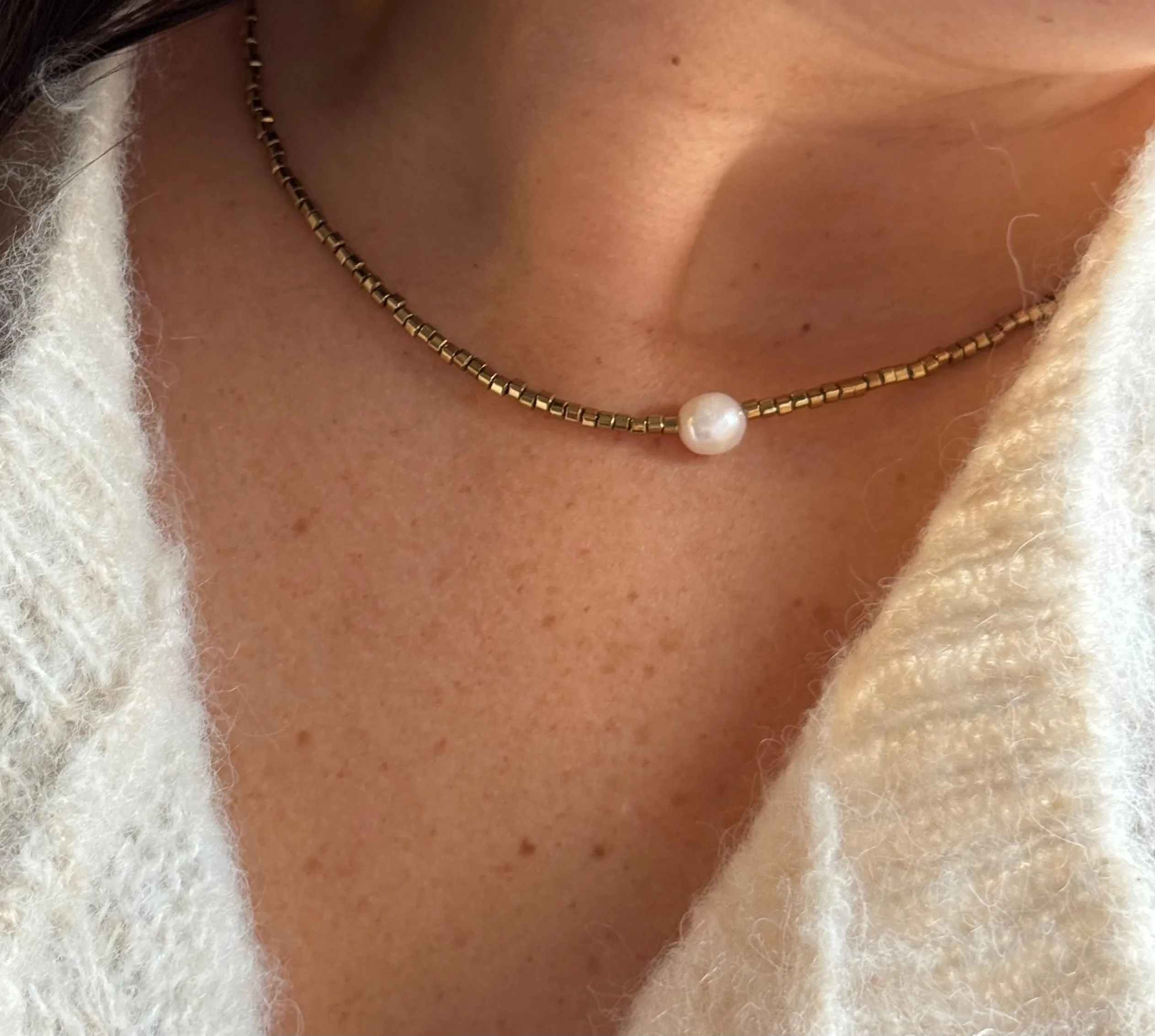 Collier composé de perles d’hématite et d’une grosse perle de culture.