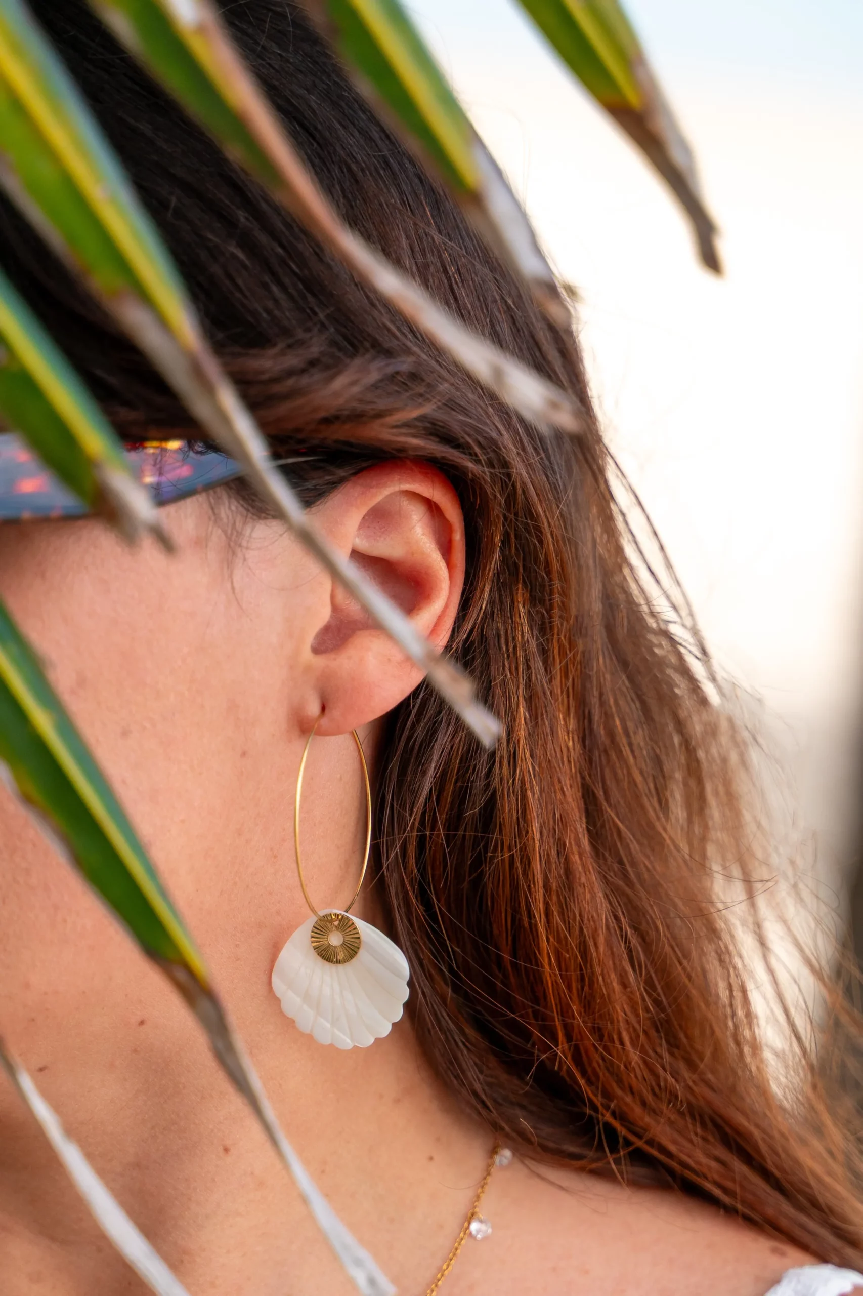 Paire de créoles (30mm de diamètres) composées d’un coquillage en nacre blanche et d’une pampille solaire dorée.