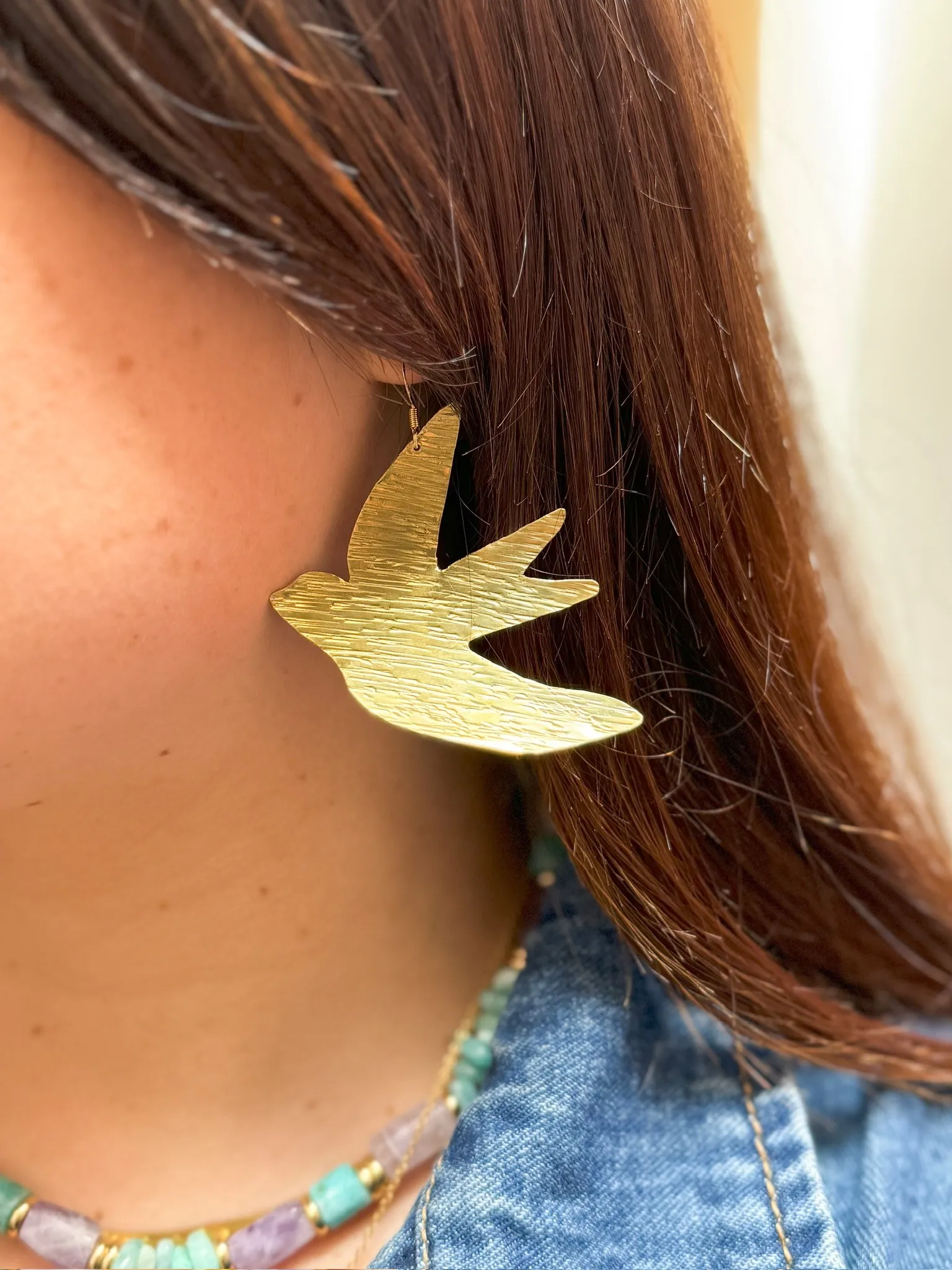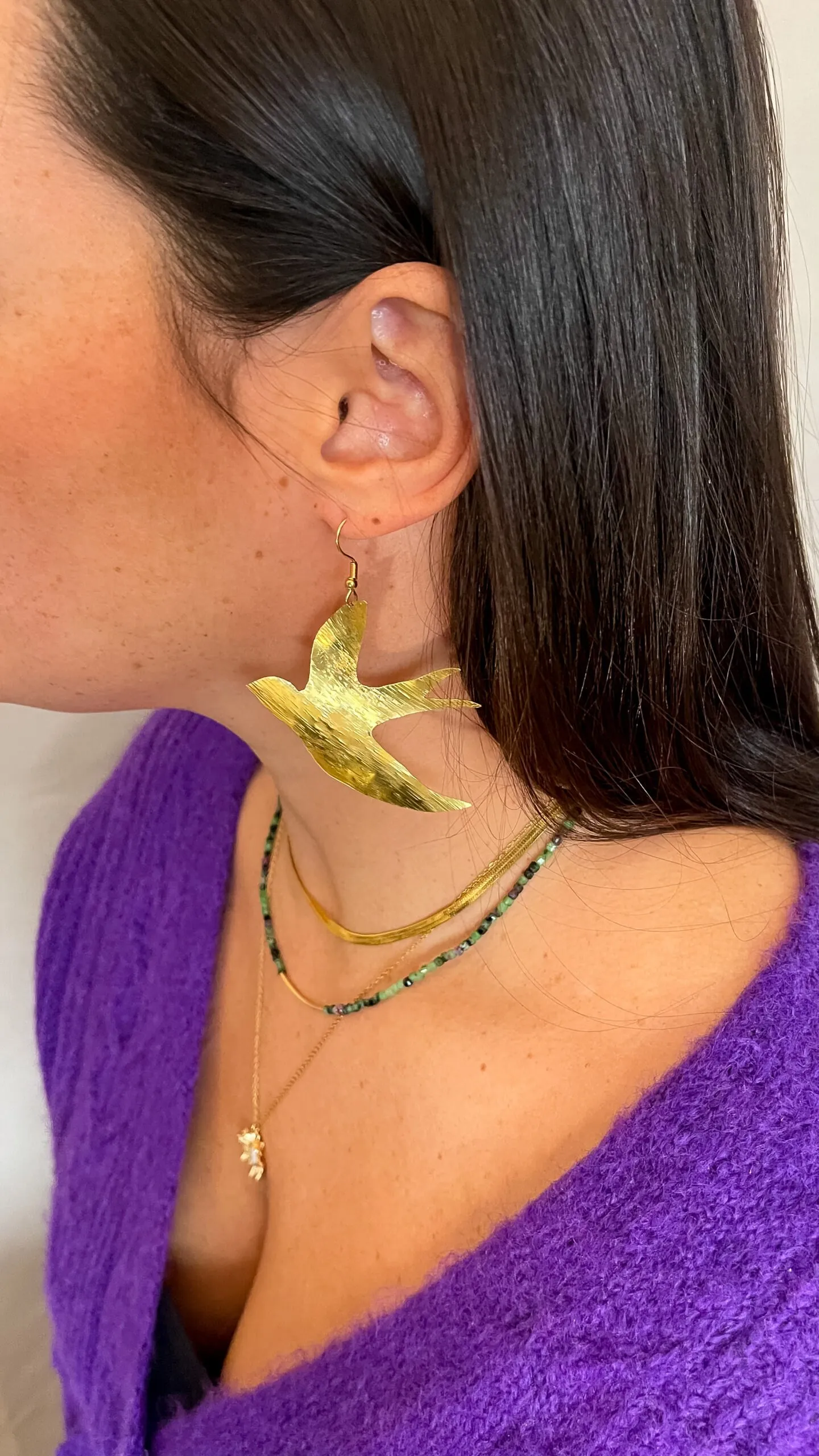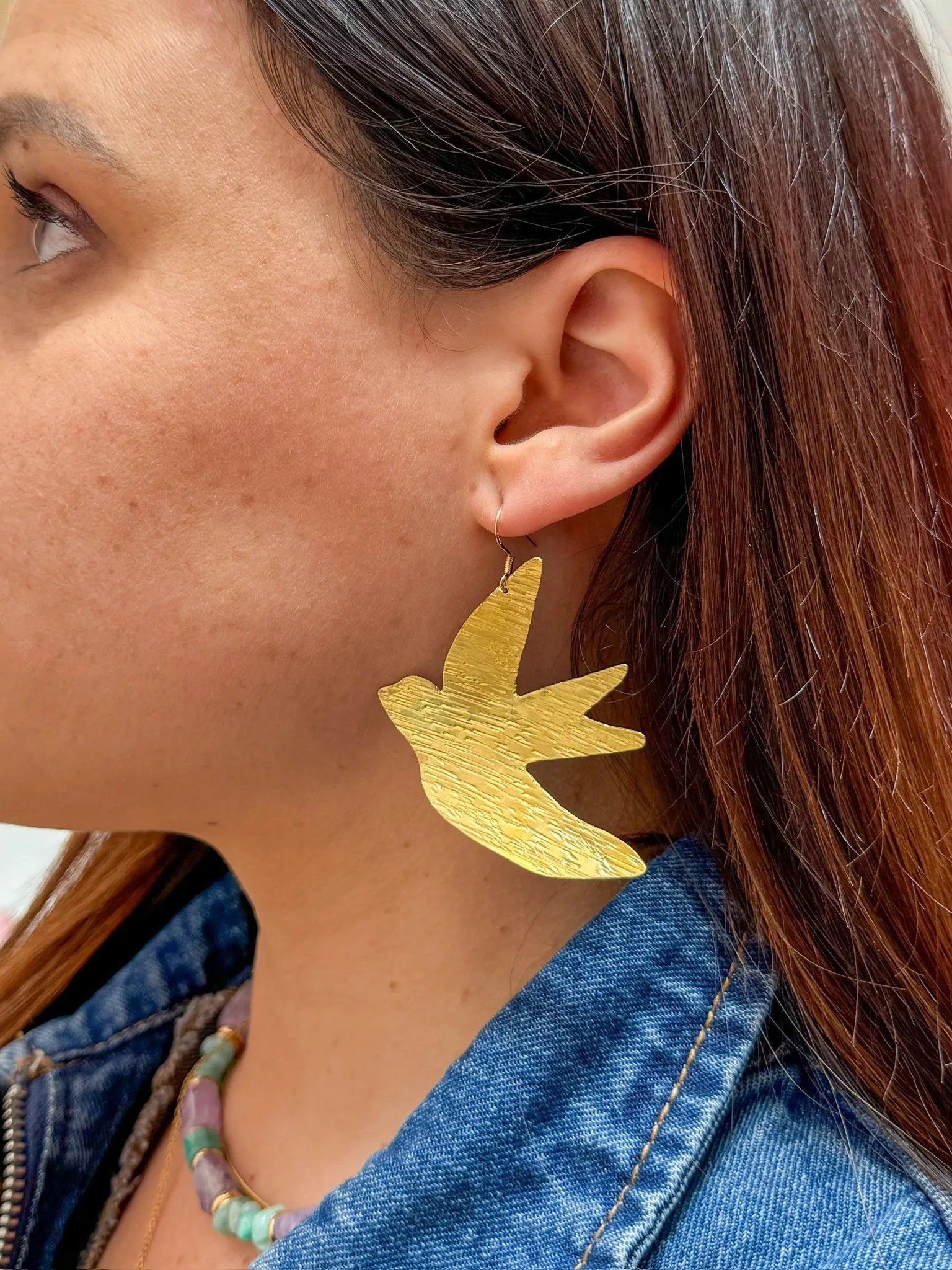 Paire de boucles d’oreilles contemporaines, légères et délicates représentant une hirondelle en vol.